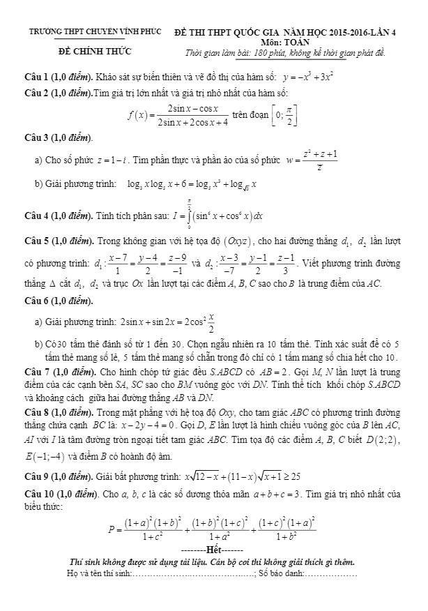 Đề thi thử THPT Quốc gia 2016 môn Toán trường chuyên Vĩnh Phúc lần 4