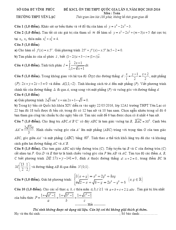 Đề thi thử THPT Quốc gia 2016 môn Toán trường Yên Lạc – Vĩnh Phúc lần 5
