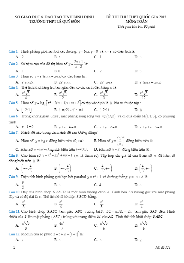 Đề thi thử THPT Quốc gia 2017 môn Toán trường THPT chuyên Lê Quý Đôn – Bình Định