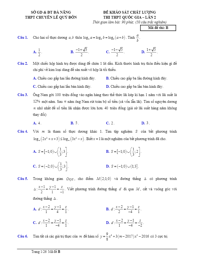 Đề thi thử THPT Quốc gia 2017 môn Toán trường THPT chuyên Lê Quý Đôn – Đà Nẵng lần 2