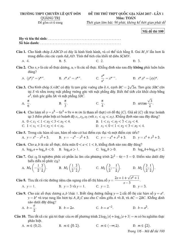 Đề thi thử THPT Quốc gia 2017 môn Toán trường THPT chuyên Lê Quý Đôn – Quảng Trị lần 1