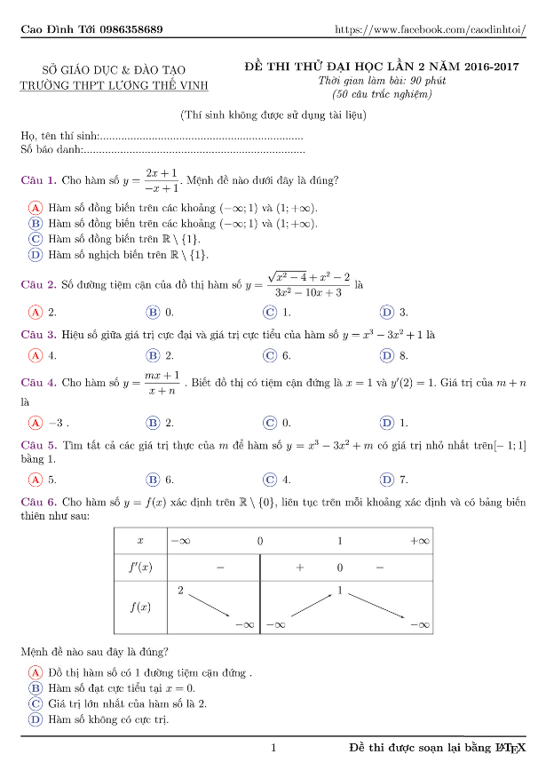 Đề thi thử THPT Quốc gia 2017 môn Toán trường THPT chuyên Lương Thế Vinh – Hà Nội lần 2