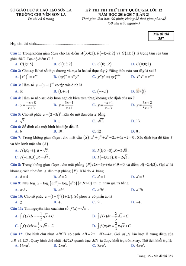 Đề thi thử THPT Quốc gia 2017 môn Toán trường THPT chuyên Sơn La lần 2