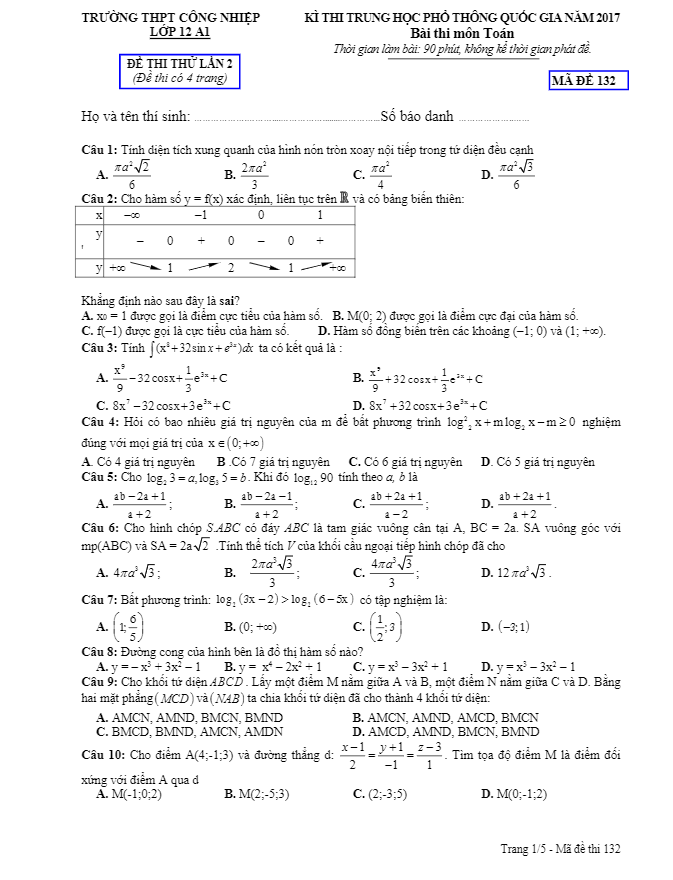 Đề thi thử THPT Quốc gia 2017 môn Toán trường THPT Công Nghiệp – Hòa Bình lần 2