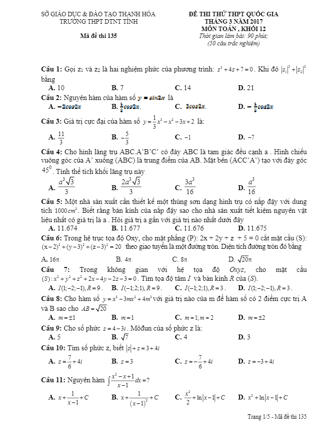 Đề thi thử THPT Quốc gia 2017 môn Toán trường THPT DTNT tỉnh Thanh Hóa