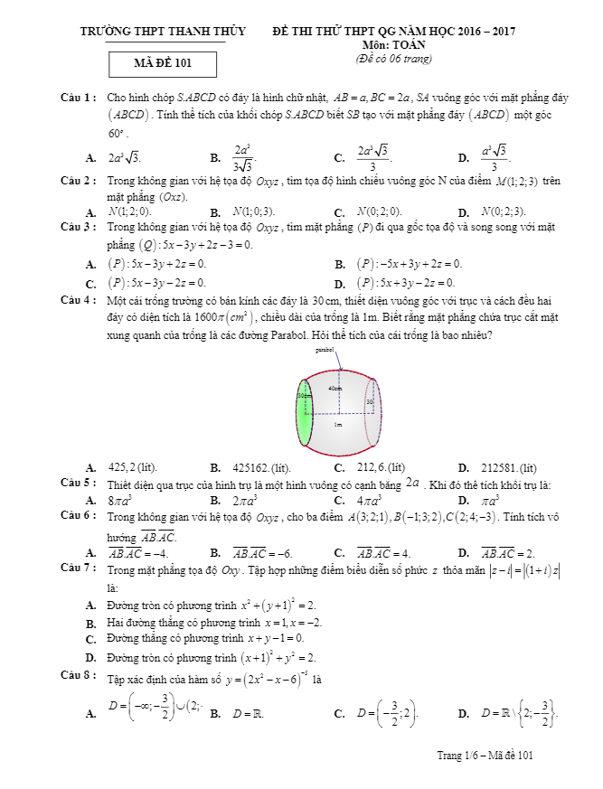 Đề thi thử THPT Quốc gia 2017 môn Toán trường THPT Thanh Thủy – Phú Thọ