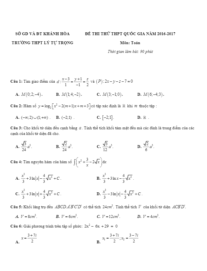 Bộ đề thi thử THPT Quốc gia 2017 môn Toán sở GD và ĐT Khánh Hòa