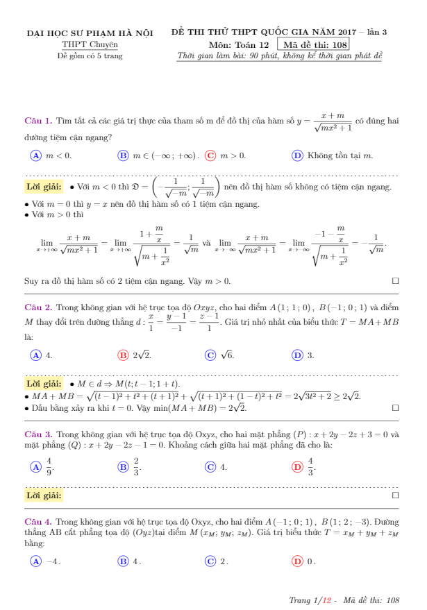 Đề thi thử THPT Quốc gia 2017 môn Toán trường chuyên Sư Phạm Hà Nội lần 3
