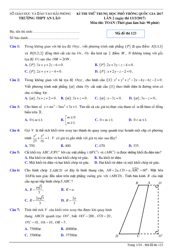 Đề thi thử THPT Quốc gia 2017 môn Toán trường THPT An Lão – Hải Phòng lần 2