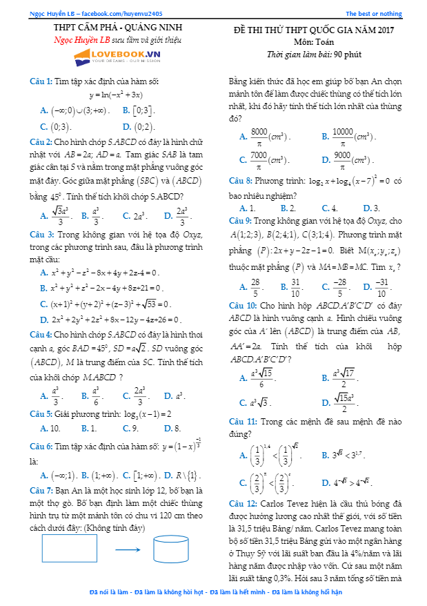 Đề thi thử THPT Quốc gia 2017 môn Toán trường THPT Cẩm Phả – Quảng Ninh