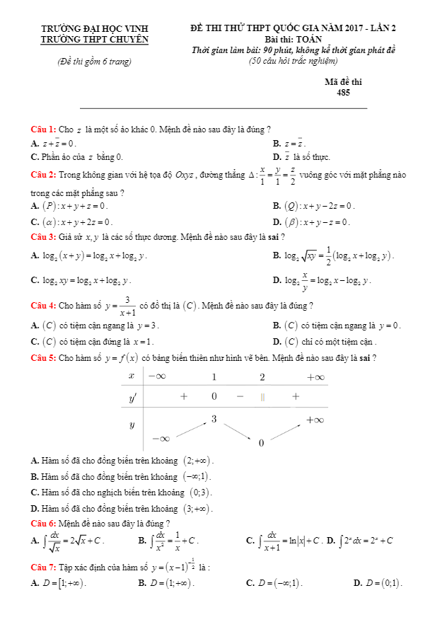 Đề thi thử THPT Quốc gia 2017 môn Toán trường THPT Vinh Lộc – TT. Huế