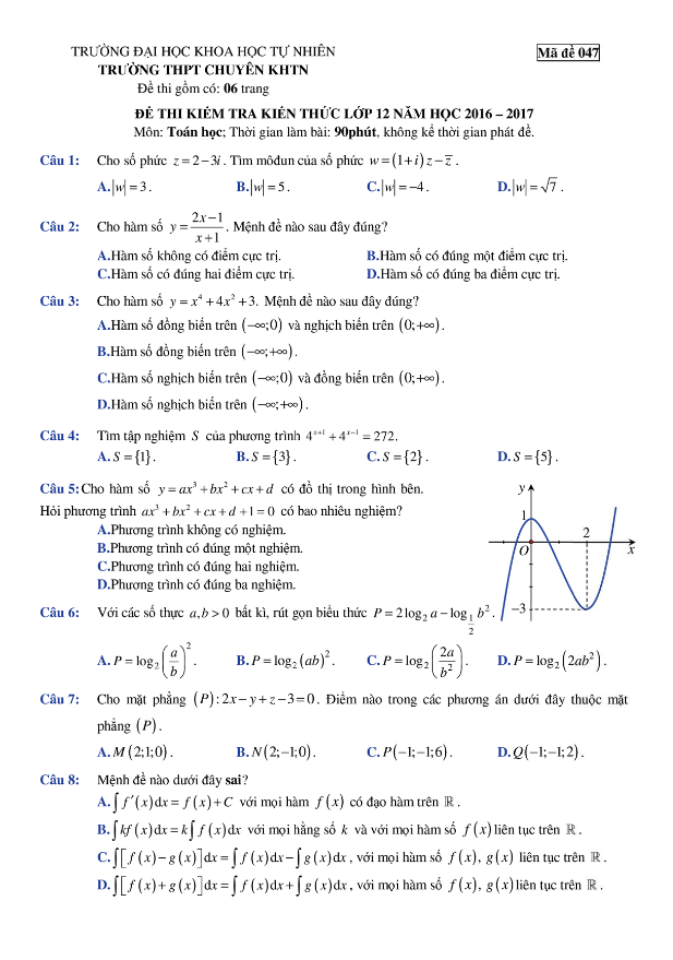 Đề thi thử THPT Quốc gia 2017 môn Toán trường THPT chuyên KHTN – Hà Nội lần 4