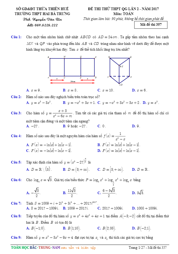 Đề thi thử THPT Quốc gia 2017 môn Toán trường THPT Hai Bà Trưng – TT. Huế lần 2