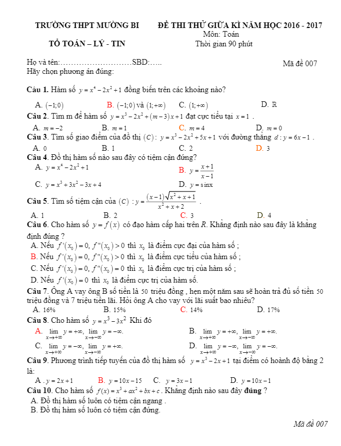 Đề thi thử THPT Quốc gia 2017 môn Toán trường THPT Mường Bi – Hòa Bình