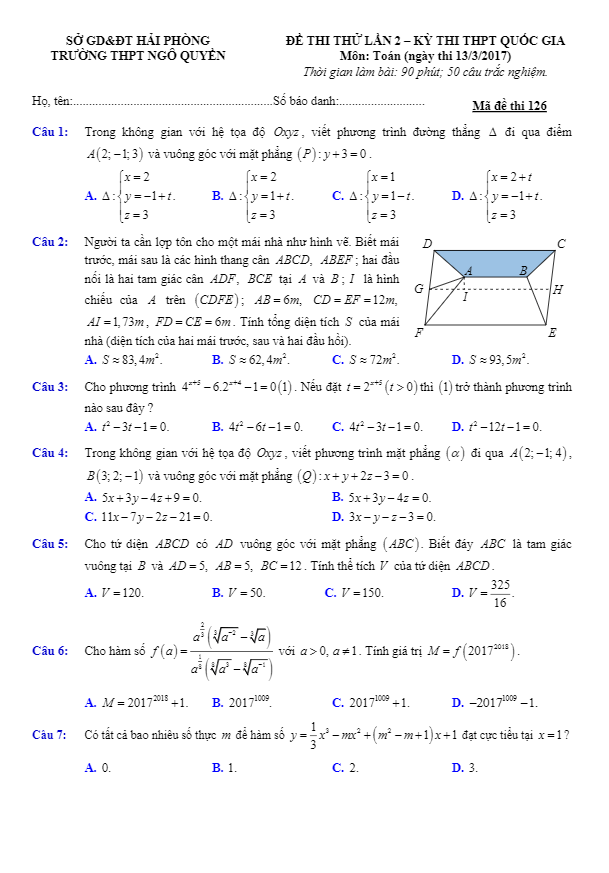 Đề thi thử THPT Quốc gia 2017 môn Toán trường THPT Ngô Quyền – Hải Phòng lần 2