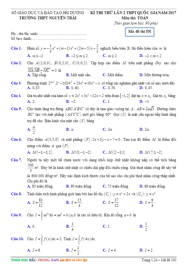 Đề thi thử THPT Quốc gia 2017 môn Toán trường THPT Nguyễn Trãi – Hải Dương lần 2