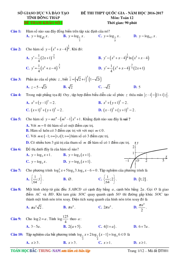 Đề thi thử THPT Quốc gia 2017 môn Toán sở GD và ĐT tỉnh Đồng Tháp
