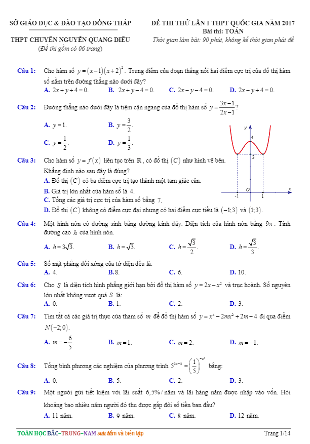 Đề thi thử THPT Quốc gia 2017 môn Toán trường chuyên Nguyễn Quang Diêu – Đồng Tháp lần 1