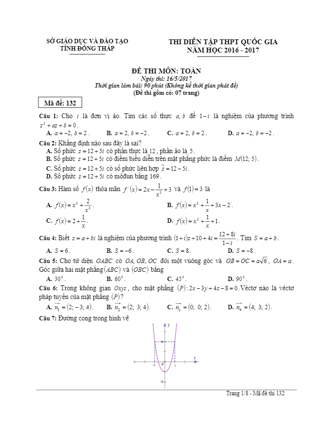Đề thi diễn tập THPT Quốc gia 2017 môn Toán sở GD và ĐT Đồng Tháp