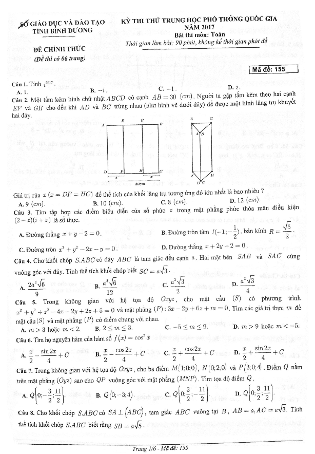 Đề thi thử THPT Quốc gia 2017 môn Toán sở GD và ĐT Bình Dương