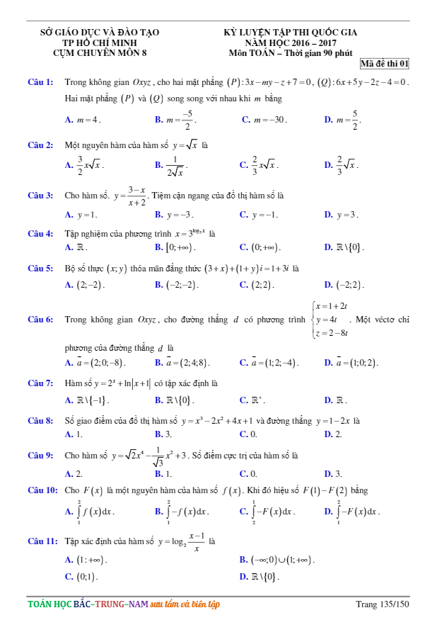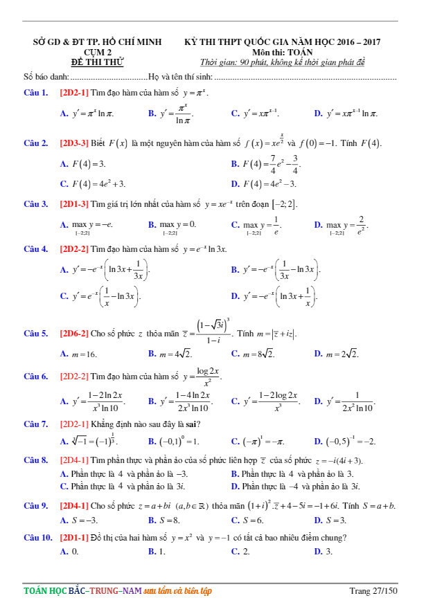Bộ đề thi thử THPT Quốc gia 2017 môn Toán sở GD và ĐT TP. HCM