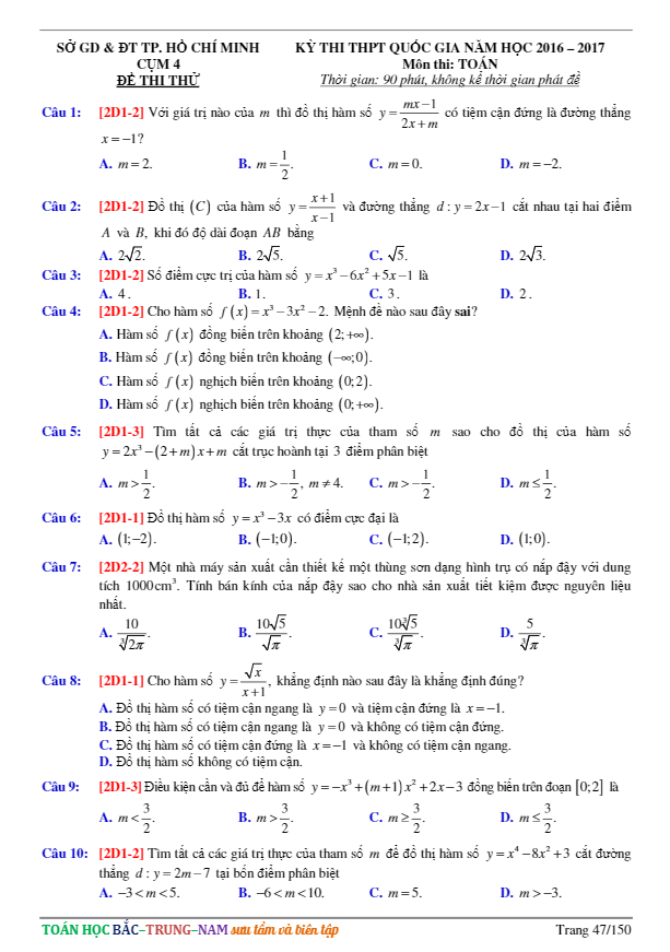 Đề thi thử THPT Quốc gia 2017 môn Toán sở GD và ĐT TP. HCM (Cụm chuyên môn VI)
