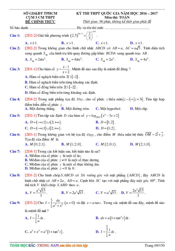 Đề thi thử THPT Quốc gia 2017 môn Toán sở GD và ĐT TP. HCM (Cụm chuyên môn V)