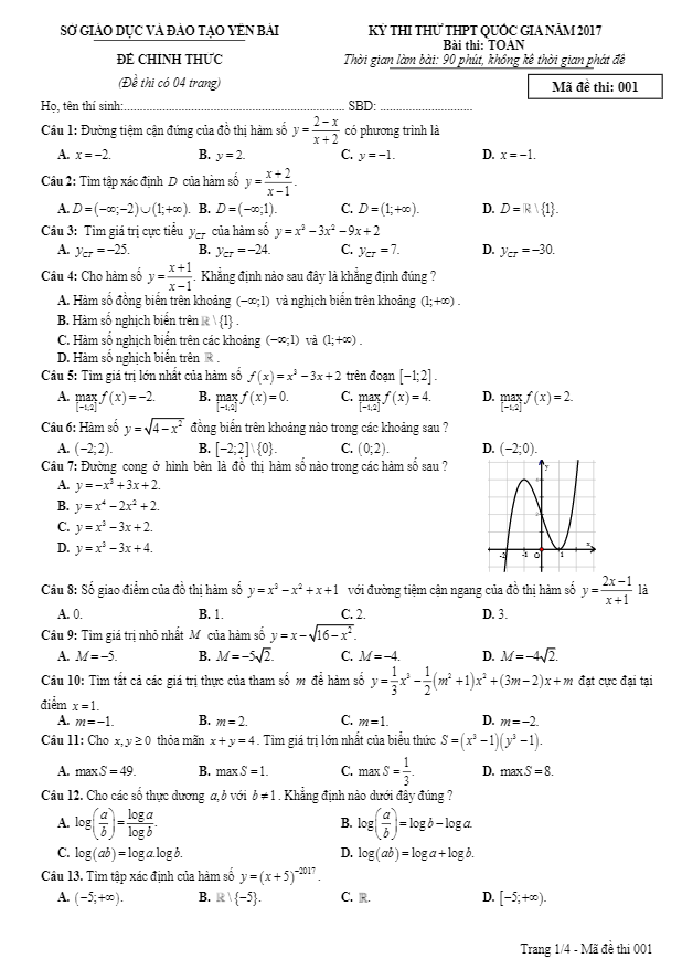 Đề thi thử THPT Quốc gia 2017 môn Toán sở GD và ĐT Yên Bái
