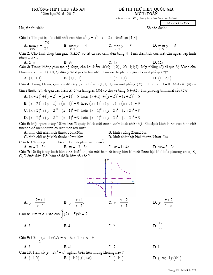 Đề thi thử THPT Quốc gia 2017 môn Toán trường THPT Chu Văn An – Đăk Nông