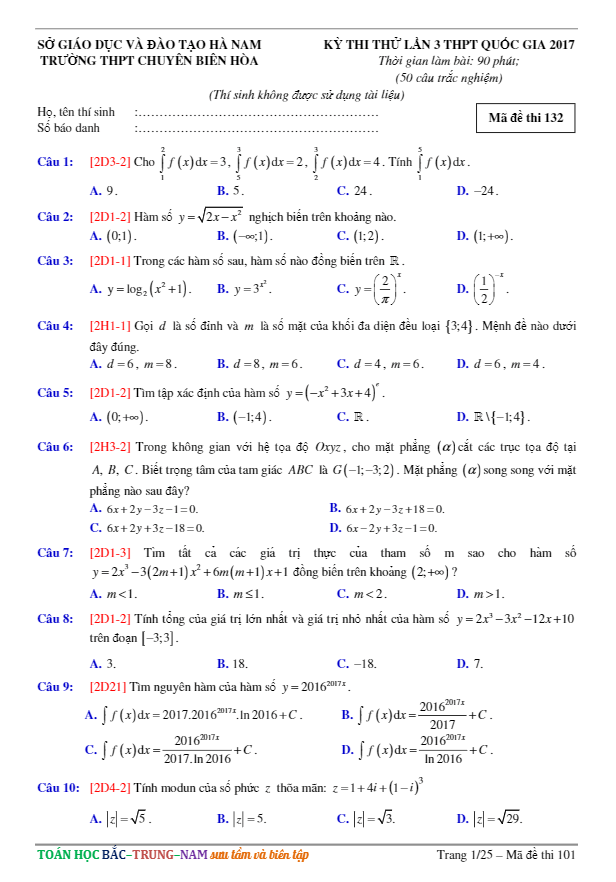 Đề thi thử THPT Quốc gia 2017 môn Toán trường THPT chuyên Biên Hòa – Hà Nam lần 3