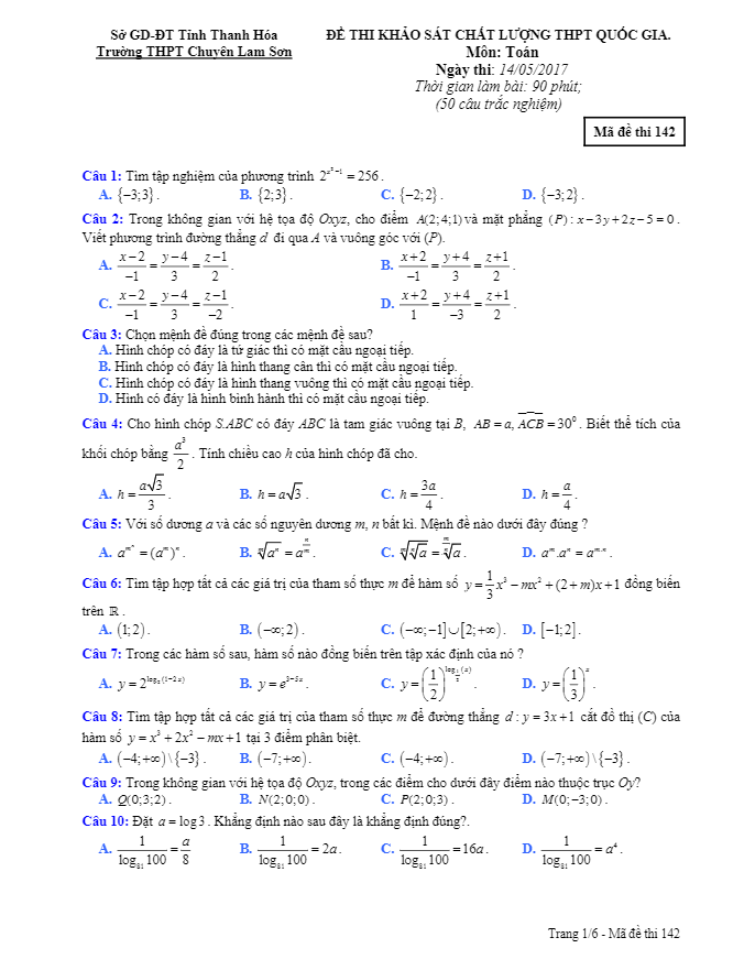Đề thi thử THPT Quốc gia 2017 môn Toán trường THPT chuyên Lam Sơn – Thanh Hóa lần 3