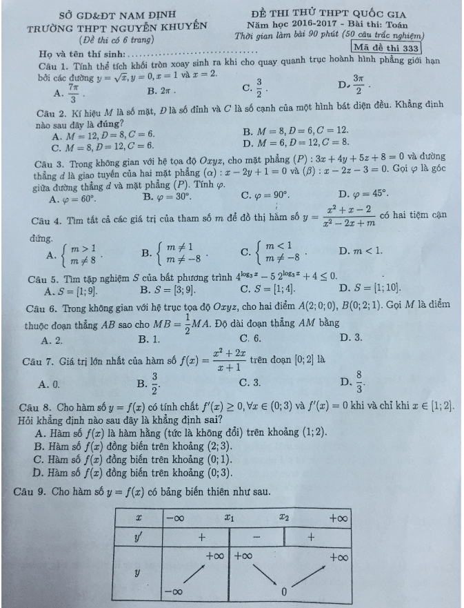 Đề thi thử THPT Quốc gia 2017 môn Toán trường THPT Nguyễn Khuyến – Nam Định