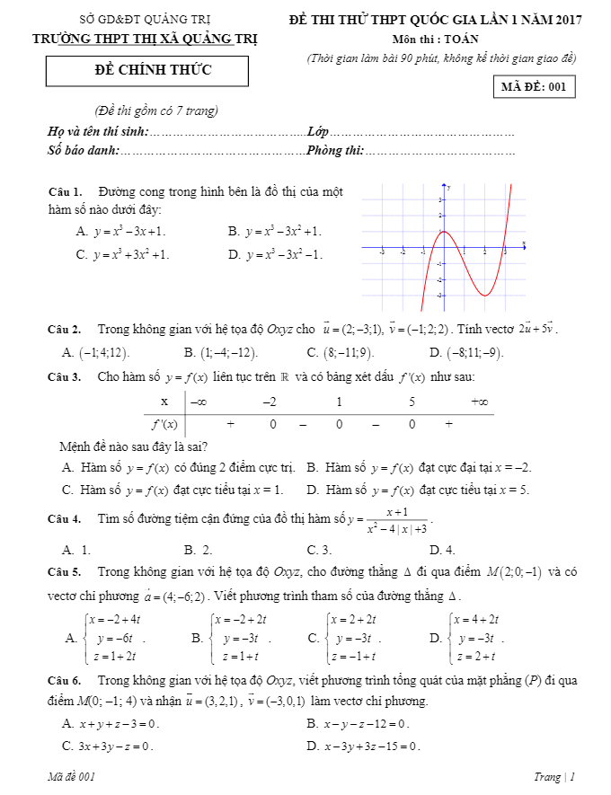 Đề thi thử THPT Quốc gia 2017 môn Toán trường THPT Thị xã Quảng Trị lần 1