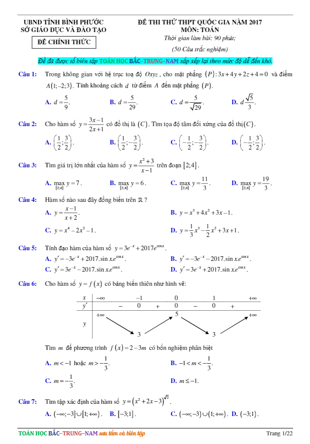Đề thi thử THPT Quốc gia 2017 môn Toán sở GD và ĐT Bình Phước