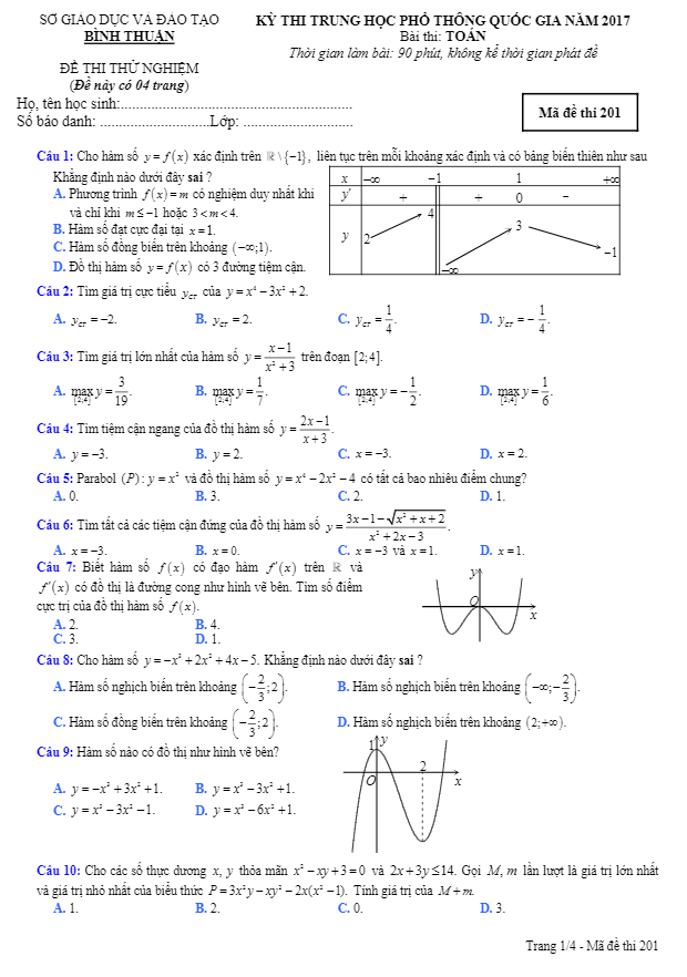 Đề thi thử THPT Quốc gia 2017 môn Toán sở GD và ĐT Bình Thuận