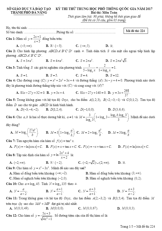 Đề thi thử THPT Quốc gia 2017 môn Toán sở GD và ĐT Đà Nẵng