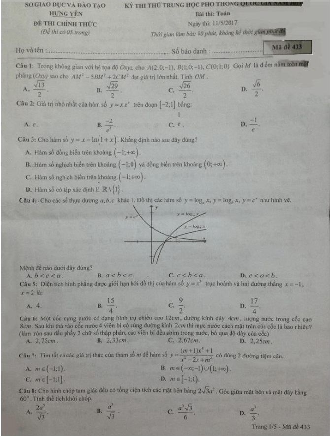 Đề thi thử THPT Quốc gia 2017 môn Toán sở GD và ĐT Hưng Yên