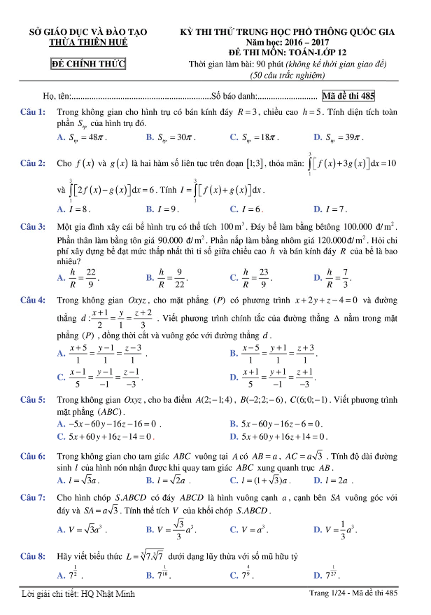 Đề thi thử THPT Quốc gia 2017 môn Toán sở GD và ĐT Thừa Thiên Huế