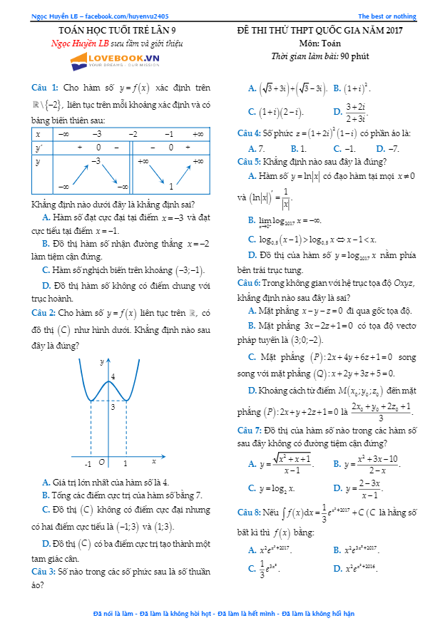 Đề thi thử THPT Quốc gia 2017 môn Toán – tạp chí Toán Học Tuổi Trẻ lần 9