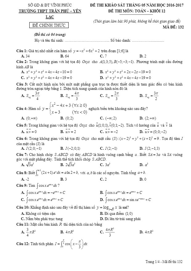 Đề thi thử THPT Quốc gia 2017 môn Toán tháng 5 trường THPT Trần Phú, THPT Yên Lạc – Vĩnh Phúc