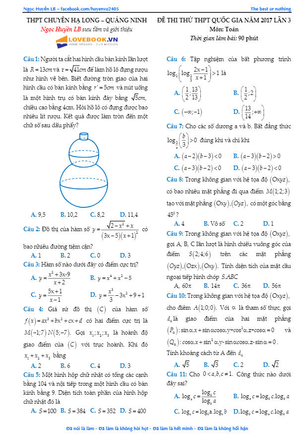 Đề thi thử THPT Quốc gia 2017 môn Toán trường THPT chuyên Hạ Long – Quảng Ninh lần 3