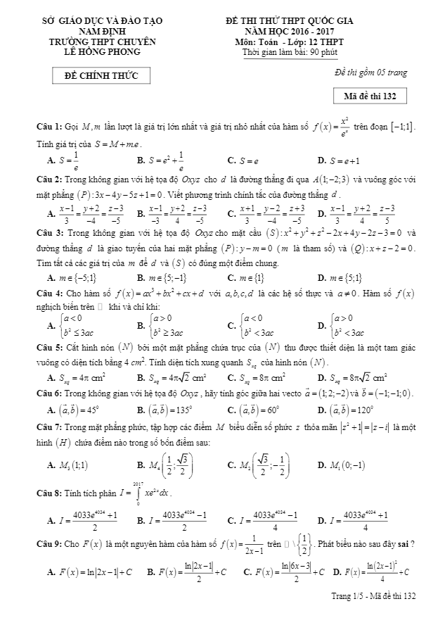Đề thi thử THPT Quốc gia 2017 môn Toán trường THPT chuyên Lê Hồng Phong – Nam Định lần 3