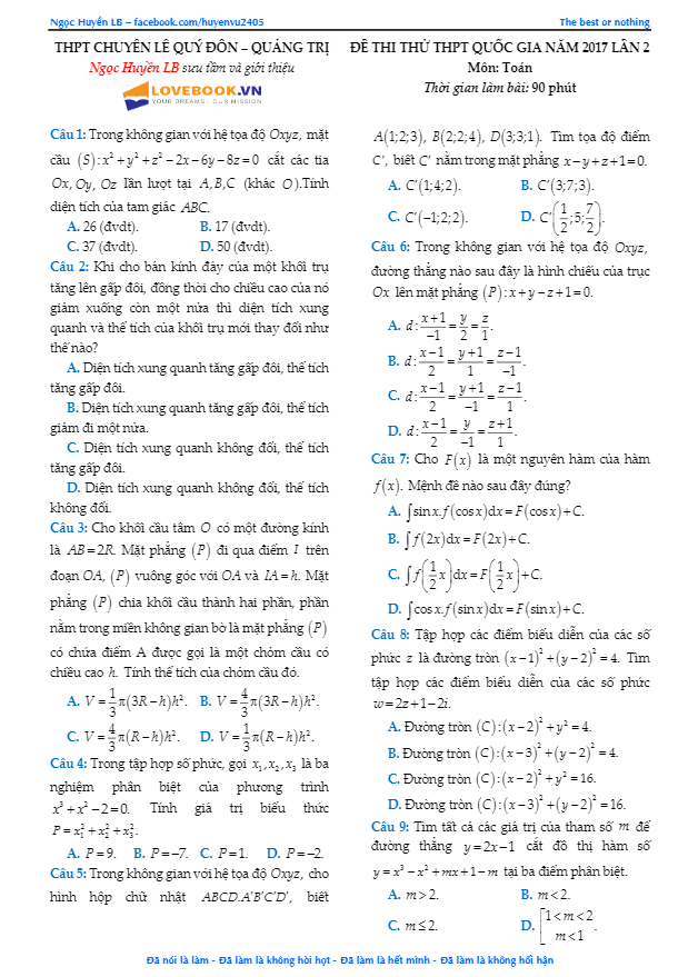 Đề thi thử THPT Quốc gia 2017 môn Toán trường THPT chuyên Lê Quý Đôn – Quảng Trị lần 2