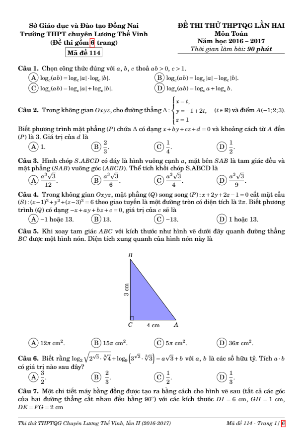Đề thi thử THPT Quốc gia 2017 môn Toán trường THPT chuyên Lương Thế Vinh – Đồng Nai lần 2