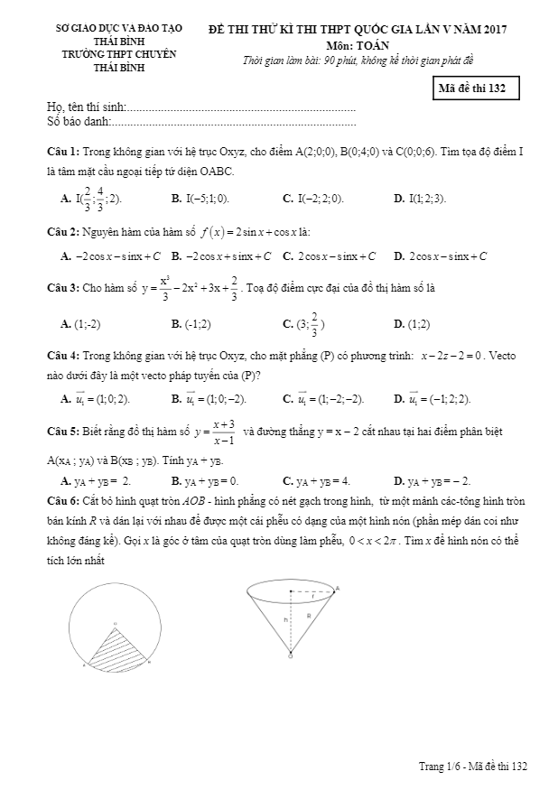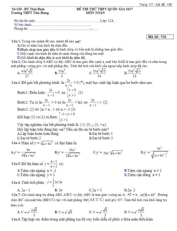 Đề thi thử THPT Quốc gia 2017 môn Toán trường THPT chuyên Thái Bình lần 5