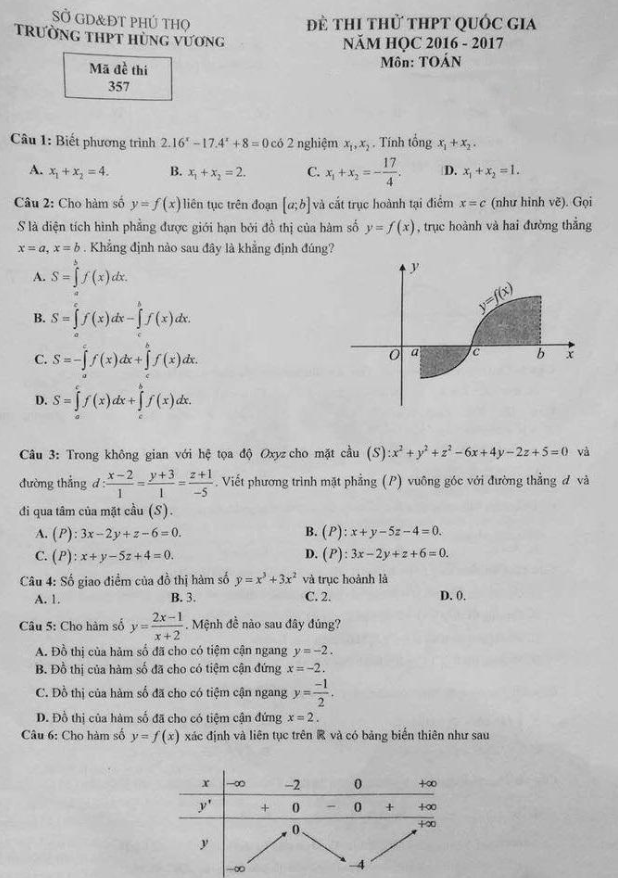 Đề thi thử THPT Quốc gia 2017 môn Toán trường THPT Hùng Vương – Phú Thọ