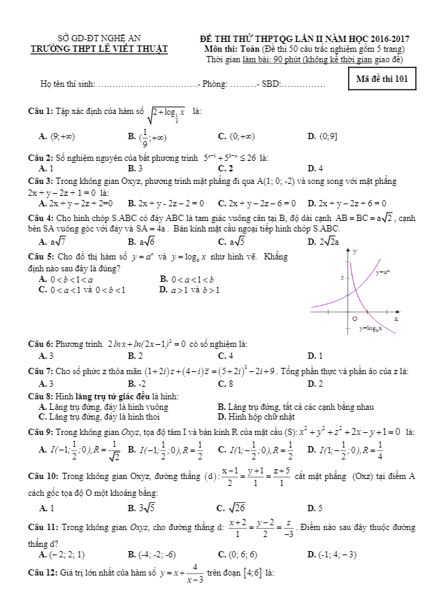 Đề thi thử THPT Quốc gia 2017 môn Toán trường THPT Lê Viết Thuật – Nghệ An