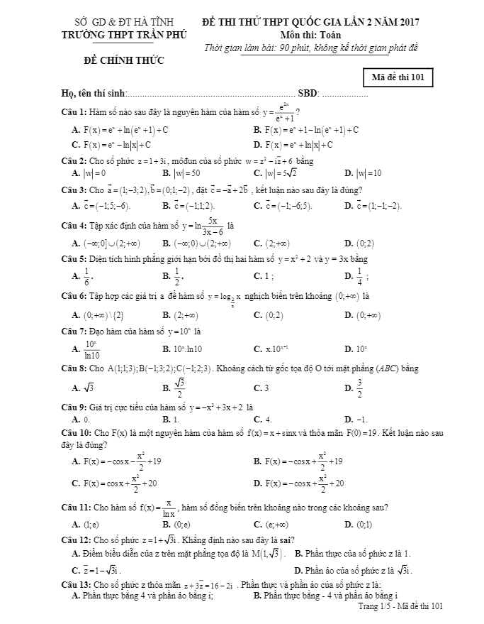 Đề thi thử THPT Quốc gia 2017 môn Toán trường THPT Trần Phú – Hà Tĩnh lần 2