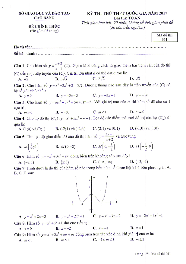 Đề thi thử THPT Quốc gia 2017 môn Toán sở GD và ĐT Cao Bằng