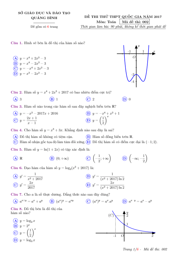 Đề thi thử THPT Quốc gia 2017 môn Toán sở GD và ĐT Quảng Bình
